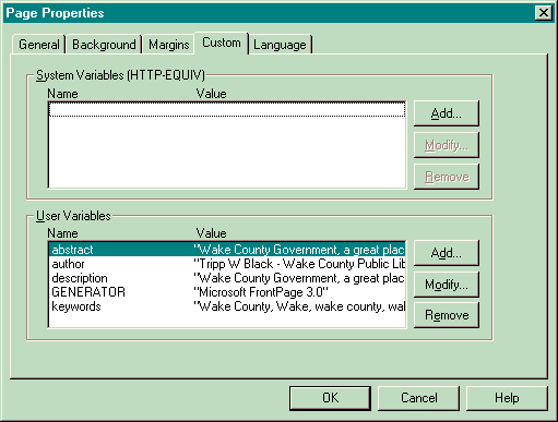 4. The upper section contains "system" variables which specify certain server/web page formatting parameters and where you can add such add-ons as ratings for your pages (similar to movie or TV content ratings.) The lower section contains the "user variables" which lists some FrontPage page configurations and the meta tags.
