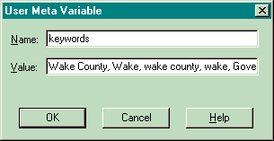 6. To create a new meta tag, press the lower "Add" button. In the upper section, enter the first variable name, and in the lower section, enter its value. Press "OK" to enter the meta tag into the page's properties.