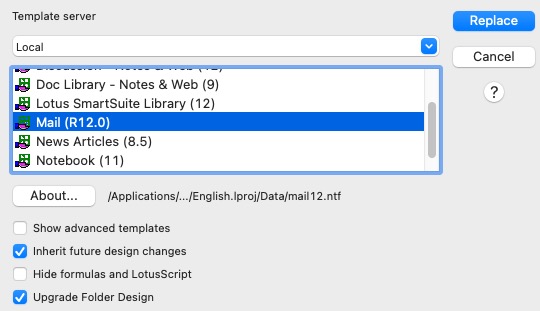 In the dialog, choose Mail 12, click the checkbox to Upgrade Folder Design, and click Replace.