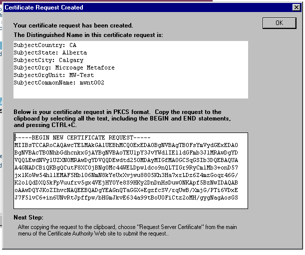 Examine the screen and insure the top white box shows the correct information. The bottom box is the request we need to pass to Verisign. You can highlight it all with click and drag then use <ctrl – c> to copy it to the clipboard. Now it is ready to paste into the Verisign form. Ensure that you include the Begin and End statements.