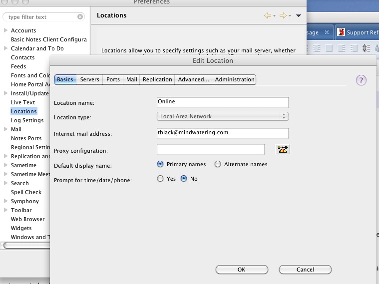 Bottom bar of Notes client, near right corner --> Online, left-click --> Edit Locations --> (Preferences Open) Select current location (e.g. Online) in the list, click Edit button